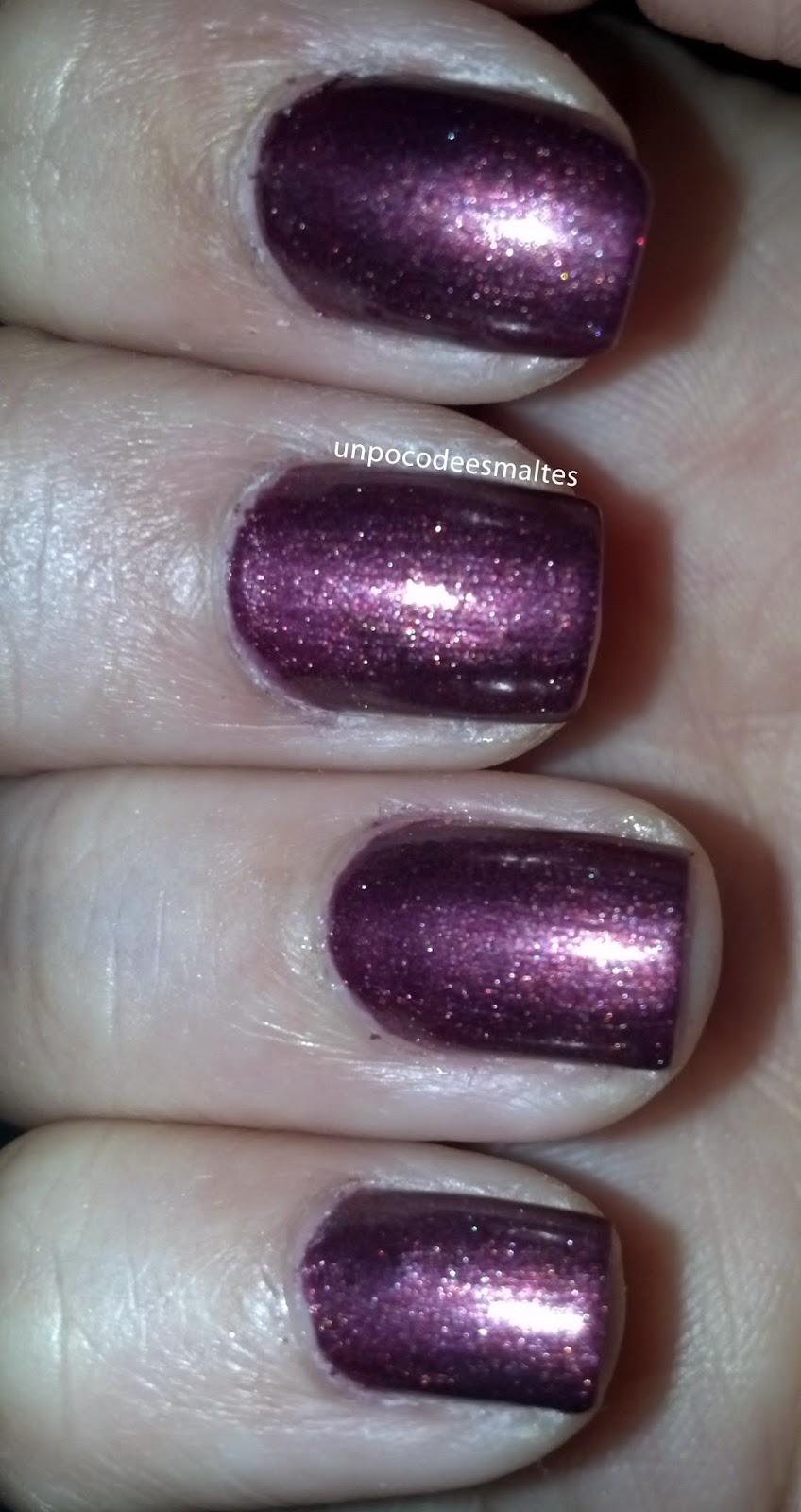 Es un bordo metalizado. Se nota que tiene algo de shimmer plateado, muy leve que lo hace brillar. Ni bien lo vi me pareció que tenia destellos holográficos(cualquiera flaca!), me gusto el tono discreto y sobrio. En el Sale lo pague 29 pesos (estoy hablando de fines de 2013), sino su precio es de alrededor de los 80.